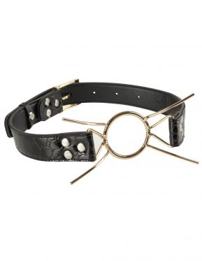 When wide-open isn't wide enough, the Fetish Fantasy Gold Deluxe Spider Gag will get the job done. This luxurious gag consists of a steel ring with four curved metal "legs" attached to the ring. The gag and legs prevent the mouth from closing, leaving your subject's mouth wide open for whatever you wish to put in it. The diameter of the ring measures 1.5-inches, and the gag connects to a leather strap with heavy-duty buckles in the back to keep the gag firmly in place. One size fits most.Fetish Fantasy Gold is an exquisite new collection of premium fetish must-haves developed for fashion-forward couples. This contemporary line of bold new bondage essentials features distinctive designs, sophisticated styling, and custom concepts created to excite and incite the modern fetish connoisseur. Experience the Fetish Fantasy Gold series today -- it's the new gold standard for all your Fetish Fantasies.