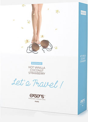 Let's Travel Massage Oil Set by Exsens of Paris is a sexy kit of warming massage oils that are packed with flavor. I enjoyed every mouthwatering flavor, which includes Coconut, Strawberry and Hot Vanilla. This is not only a massage oil, but gives you a warming effect with every stroke. Your sensual massages will never be the same with this new product by Exsens of Paris. The packaging is great for both the retail store or home parties.