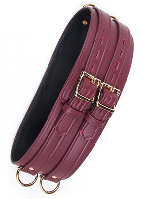 The quick, sexy and easier way to restrain! The Stockroom’s JT Signature Collection Waist Cuff is so versatile, comfortable and sexy. It comes in a deep maroon-type color and is lined with black glove leather for comfort. I cannot say enough about the many uses of this extremely versatile piece. The attachment points and buckles (with optional locking ability) is 18k gold plated, and comes in four sizes. It has two attachment points on either side of the waist cuff and two more that can be worn in the front or the back. The possibilities are endless for uses of bondage with this amazing piece. This can be attached to restraints for the wrists, thighs, ankles, a collar, or even nipple clamps. The great thing about this piece is that it can be used by any level kinkster, from beginner to novice.