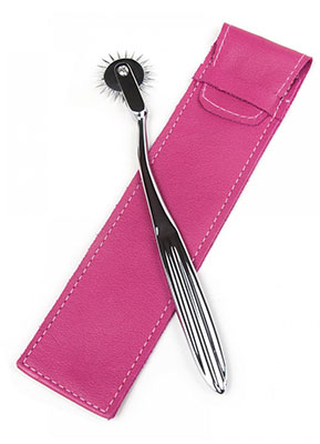 This classic Wartenberg Pinwheel comes in a fetching leather sheath cut and stitched in The Stockroom's Los Angeles workshop, and designed to evoke Joanna Angel's signature streak of vibrant punk-pink hair.One of our most popular sensation play toys, the Wartenberg Pinwheel is great for revving up your partner's engine with tingling, teasing touches that feel amazing everywhere you roll its stimulating pins.