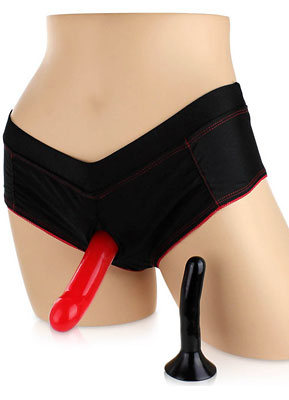 Strap on adventures in style! This sexy scarlet and black boyshort panty lets you comfortably strap on full-sized dildos now in Plus Sizes.The stylish boyshort panty looks and feels so good when you put it on with contrasting red stitching and accents add a touch of flair to the racy black panty. A supportive elastic band at the waist keeps this panty secure no matter how you move that fits sizes 14-20. But the real party doesn’t start until you strap one on! The Plus Sized Scarlet Strap-On Starter Set includes two dildos, beginners may want to start with the slim black dildo. It’s made from soft and flexible TPR, and designed for the easiest entry. For the more advanced players you may want to move to the wider red dildo with its rounded head is designed for a more intense feel.