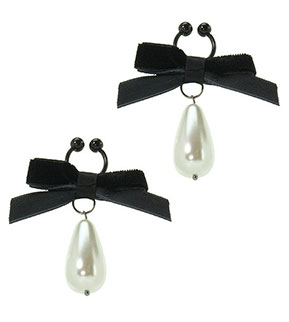 Feeling glum because you don't have pierced nipples but want to dress them up for a fancy occasion? No need to worry anymore with these beautiful non-piercing nipple rings. Now get the look without the pain and permanence. These vintage-inspired rings add class to any pair of nipples. Black bows made of velvet and a dangling glass pearl make my nipples look ready for any special event. My partner found them irresistible and so will yours. Who doesn't like a dressed up nipple.