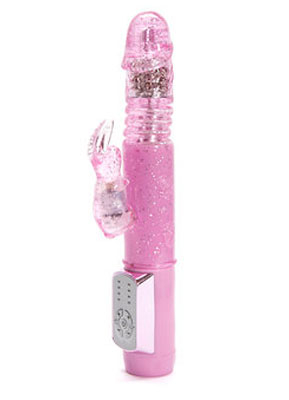 Give your toy box a glamorous new addition with this svelte and glittery rabbit vibrator. Small in size but big in sensation, its 5 inch pink shaft thrusts up and down for realistic stimulation, while the flickering ears offer 4 exciting vibration modes.This little rabbit vibrator has built-in push-button controls for independent operation of the ears and shaft for tailored, blended pleasure. Explore 3 speeds of thrusting and rotation, 1 pattern and a reversible option for delectable internal massages, and 3 thrilling speeds and 1 pattern in its ears for dual clitoral stimulation.