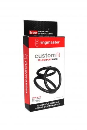The Ringmaster Custom Fit Tri-Support Case is a trim-to-fit triple ringed cock ring system. It comes in a simple, no frills box, just big enough to hold the rings and a sample of lube. There is a nice, clear and to-size image of the rings on the front of the box, so you know just what you are getting.