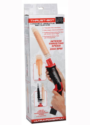 Do you find yourself looking around the sex store thinking none of this will do it? Do you need something that is heavy duty, powerful and then can maybe handle a chore or two? Well dig a little deeper and find the Love Botz section and pick up the Thrust Bot, the handheld versatile sex machine. Not for the faint of heart, this baby has a thrusting speed of 2,000 RPM! It features a traditional reciprocating saw-style movement with a variable speed trigger. It comes with a dildo attachment but there are many other attachments sold separately. Now I just need to figure out where to keep this thing, perhaps in the tool shed…