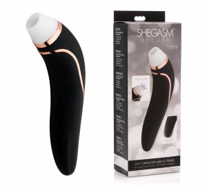 Experience simulated oral sex and buzzing bliss with a rechargeable sex toy that sucks on your clitoris and vibrates within you! Play with 11 levels of suction power and pulsing patterns when you place the tip around your clit. Turn the Shegasm Deluxe around and use the firm shaft to explore external and internal pleasure with 3 speeds and 7 functions of thrilling vibration. Find your perfect level, from a gentle purr to orgasmic nirvana! Made of premium silicone, this double-ended pleasure tool is non-porous and phthalate-free. Clean with mild soap and warm water and avoid use with silicone lubricants.Copyright © 2026 Adnet Media. All Rights Reserved. XBIZ is a trademark of Adnet Media.