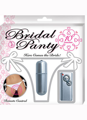 “Here comes the bride!” the package exclaims and no doubt, she will. The silky white panty has ties on the side to fit any woman’s body while the remote-controlled, 10-function waterproof bullet vibe slips into the hidden pocket for that secret buzz that will have her saying “I do!” in no time. My bridal fantasy is that she has it on walking down the aisle with her soon-to-be spouse giving her a zing before the ring while the wedding guests have no idea what’s going on. They’ll think it’s nervous laughter and that for sure will make it the next viral video on YouTube.