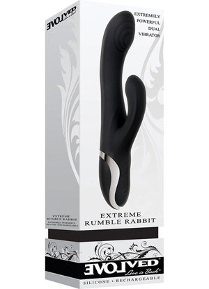 Experience an extreme intimate rumble with this Extreme Rumble Rechargeable Rabbit Vibe by Evolved Novelties.A featured item in the Extreme collection this intimate rabbit vibrator offers a smooth, round tip perfect for easy insertion while a convenient, push button display offers 10 functions and 3 speeds at the tips of your fingers. Crafted from high quality, soft silicone material this intimate massager is waterproof, phthalate free, and latex free and measures a joyful 9" long with a satisfying 5.3" girth (1.7" in diameter).
