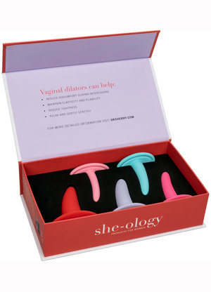 Finally, a set of silicone vaginal dilators that is firm enough to penetrate tightened vaginal walls. CalExotics’ recently released She-ology 5-Piece Wearable Vaginal Dilator Set, created by prominent gynecologist and author, Dr. Sherry Ross, ranges from a very slender, 0.53-inch wide dilator to a wider, 1.18-inch option.