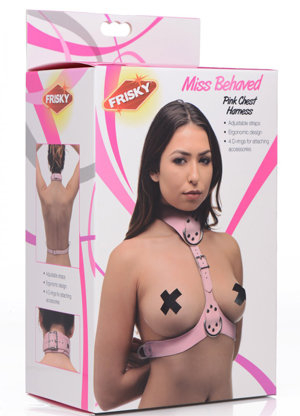 Provocative in pink! The Miss Behaved Chest Harness is the perfect combination of sweet and sassy, made with seductive vegan leather and sturdy hardware, but in an innocent shade of baby pink. The harness is equipped with 4 D-rings that serve as attachment points for other BDSM accessories such as leashes, chains, or ropes. The 3 adjustable straps secure with buckles so that you can easily find the perfect fit for yourself or your plaything. This harness was artfully crafted with the curves of the body in mind. Wear it at home with nothing underneath, at a sexy party with some lingerie, or even out on the town over an outfit!Copyright © 2026 Adnet Media. All Rights Reserved. XBIZ is a trademark of Adnet Media.