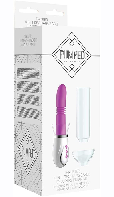 Prepare to be pumped and plumped with this versatile 4-in-1 couples pumping kit by Shots. Boasting attachments for Breast, Clitoral and Penis pumping, everyone in the bedroom will enjoy the increased sensitivity that pumping provides as their erogenous zones swell with delight. Not only that, this little beauty also comes complete with a thrusting dildo attachment, meaning this really is the accessory for every occasion and allows simultaneous thrusting and clitoral suction for an incredibly pleasurable experience. Boasting 4 different suction strengths as well as 7 different vibration modes, the combinations are endless with this kit and the powerful 11000rpm motor really hits the spot when it comes to tingly, tickly pleasure.