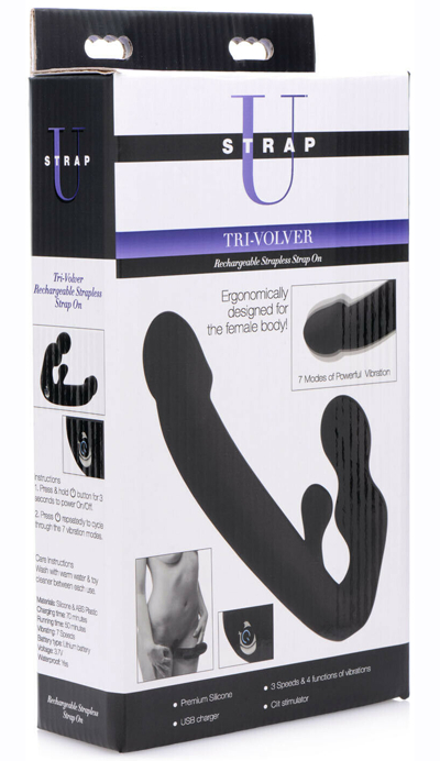 Kegels. Clit stim. Penetration. What do you get when you combine all of these attributes? The Strap U Tri-Volver, a nifty silicone toy made for hours of perfect pegging pleasure. The ergonomically correct, two bulbed, insertable vaginal base allows the wearer the ability to get some good kegel exercises going on while the little thumbnail sized protrusion shares delicate, external clitoral teasing. The 6” long, 1 ¼” wide, rechargeable pegging pole offers seven speeds and functions to put the lucky pegee into orgasmic orbit while the pegger gets to enjoy the vibrations as well. The excellent design will make this a preferred play partner for years to cum!