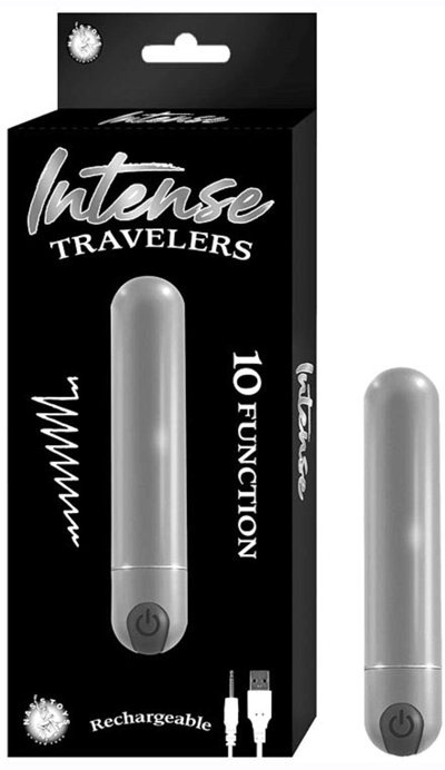 Intense Travelers Bullet Vibrator features 10 functions packed into a tiny but powerful motor. Made of aluminum, it's waterproof, Phthalates free, RoHS compliant.