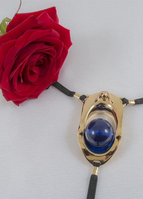 Words cannot express the overwhelming beauty of this amazing, handcrafted piece of genital jewelry. The golden oval’s feature is a large, marble-sized, clear blue ball with black elastic bands to encircle the waist and slip between the legs to hold the adornment securely in place.