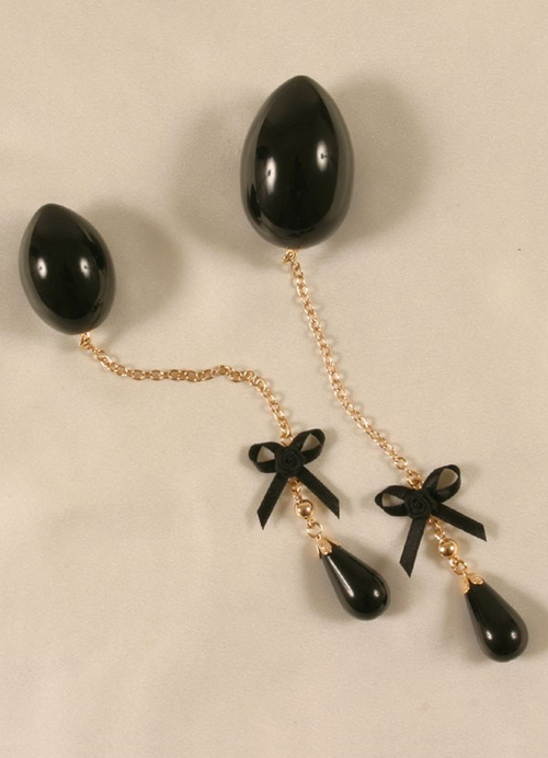 At last, a gorgeous Kegel exerciser that you never want to take out! The smooth, egg-shaped, jet black resin egg has a delicate gold chain leading to a jaunty black bow with a little flower and a tear drop at the end. Simply slide the egg inside and admire the dangling chain and bead adornment while you tighten and relax your inner PC muscle. Made to sex up your usual Kegel routine or just as pussy jewelry, this would also be a beautiful piece to show off, for all you cam girls out there.
