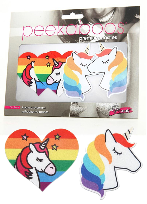 Awwww, unicorns and rainbows. Does it get any better than this? Why, yes it does when they are on pasties! Delight and enchant with the two pair of darling, self-adhesive pasties in the shape of a unicorn and in the favorite, heart shape, too. These comfortable, satiny pasties are perfect for playtime, tease time or anytime when you want to be as unique as a unicorn!
