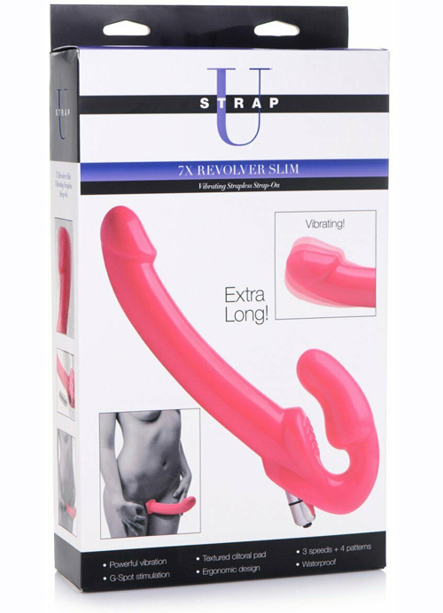 Penetrate harness free with the Revolver strapless Strap-On! This Strap On is extra long, but not too thick for those who crave a deep hitting feel without an uncomfortable stretch. Equip your hips with the long shaft you deserve, without a pesky harness to get in your way!This long and meaty shaft is designed to be held up and supported with the help of your kegel muscles - insert the vaginal bulb and give it a squeeze and enjoy the sight of your new personal shaft of pleasure! The vaginal bulb stimulates the wearers g-spot with every thrust, while the clitoral pad rubs and grinds against the clitoris for blended pleasure with every motion.The powerful bullet vibe easily slips into the cavity of this strap on dong to give both the wearer and their partner 3 speeds and 4 patterns intense vibation. Flip through each function with the on-board power button and find which pattern suits you play style!Made with durable and flexible materials for a fulfilling yet forgiving experience with every session. Compatible with water based lubes only.