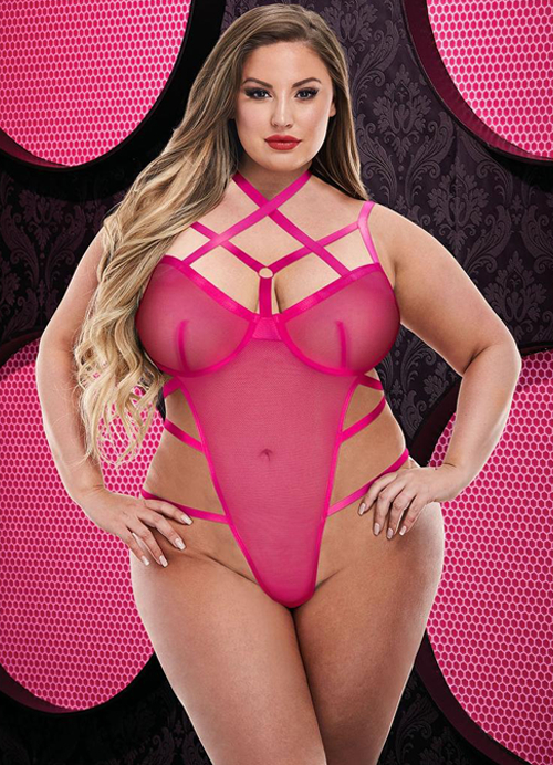 Sheer, strappy and sexy - the perfect lingerie combination! This sensual teddy is perfectly designed in sheer mesh, with strappy details across the chest and high to the neck. Open sides lend to more straps, encircling high along the waist. Available in midnight black and neon pink, pair this with thigh-highs and you have the perfect set! Offered in OS and QS.Copyright © 2026 Adnet Media. All Rights Reserved. XBIZ is a trademark of Adnet Media.