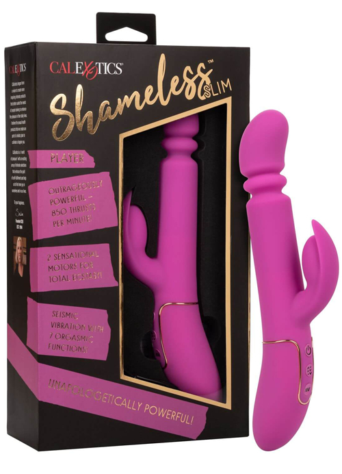 The power of a sex machine in the palm of your hand – now that’s Shameless™! This luxury massager is unapologetically powerful with up to 850 thrusts per minute and a vibrating stimulator that will blow your mind. With a sexy, slim shaft; this sensational vibe has it all.There is no shame in this game! Experience all the thrusting pleasure you crave with this Player. It features 4 functions of vigorous up-and-down motion and is made with body-safe silicone that feels amazing on the skin. This thruster features dual stimulation with 7 different functions to choose from. The teaser flickers to hit all your hot spots. Plus, the thruster and vibrator are controlled independent, so you can customize the fun any way you like it.