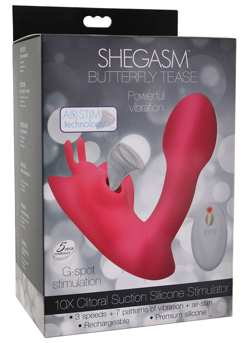 Focusing its sweetly swollen tip on inner sweet spots and a silky butterfly teaser with Air-Stim suction on outer pleasure places, inmi's Shegasm Butterfly Tease is about to blow your average vibe experience right out of the water. Luckily, it's waterproof! Intrigued? You should be.Featuring two distinct stimulation areas, the Butterfly has every single one of your or your partner's sweet spots covered. Classically shaped, a silky, curvy shaft delves deep to target and stimulate your/their g-spot, p-spot and/or other innie erogenous zones with ten modes of vibration. Meanwhile, an equally curvy butterfly shaped cup reaches up from below to direct ten synchronized patterns of positive and negative pressure straight to clitorises, perineums and beyond.