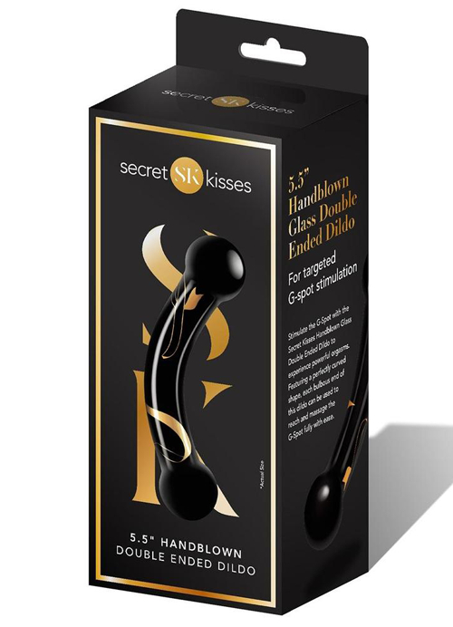 Handblown from elegant black glass with golden swirl accents, the Secret Kisses Double Ended Dildo makes a stunning addition to your sex toy collection.The dildo is designed for both G-Spot and P-Spot play, so you can keep it all to yourself or share it with your lover. The shaft is curved at the perfect angle to make your spot easy to find, while the large bulbs on the ends make it easy to please as well.