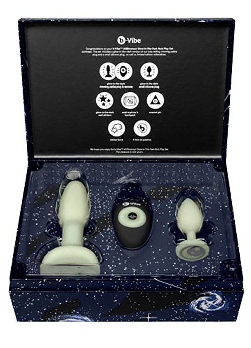 Blast your booty into the OH-zone layer with the new b-Vibe ASStronaut Glow-in-the-Dark Butt Play Set!Start your anal training mission with the non-vibrating, beginner-friendly plug before rocketing off into the stratosphincter aboard the intergalactic star, the Rimming Plug Petite.