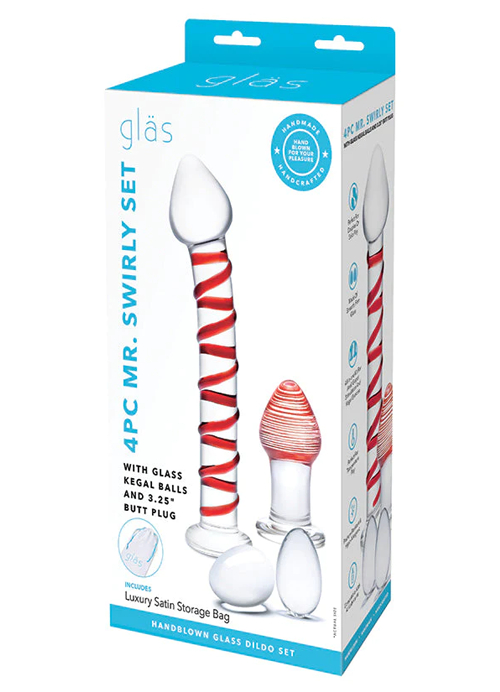 Mix and match items from this 4-piece set for an orgasmic experience during a solo session or partnered play unlike any other. This set can be used. Strengthen kegels with the glass yoni eggs or enjoy backdoor stim from the beginners-friendly butt plug. For deep G-spot stimulation, Mr. Swirly offer an intense massage.