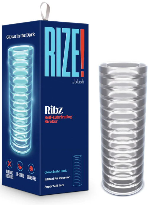 The RIZE! Ribz is the ultimate stroker. The soft ribbed orifice strokes and massages you as you control the tightness by applying desired pressure. Self-lubricating, just add saliva or water and you’re ready to play. It glows in the dark to add excitement to your night! Ribz is open-ended, easy to clean and contains no phthalates, paraffins, or latex.