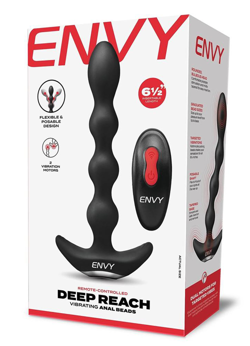 Looking for something beaded, suuuuuper flexible and powerfully vibrating to pay with? Found it! Offering you and maybe a butt-play loving partner four swells of stretching, stimulating bliss, the Deep Reach Remote Anal Beads are great for anal stimulation seekers all across the proverbial board.As highlighted by all those extra u's up top, this Envy piece is extremely flexible. You or they will be able to bend and flex it to any specifications you might have, plus, it'll naturally adapt to any position changes or sex-motivated movements. The four smooth beads are uniformly sized and shaped - minus the first bead, which is thickly swollen for a good solid ‘pop’. Deep Reach's wide base makes removal, re-positioning and sexy tugs/twists a breeze, plus, it helps protect against too-deep slips.