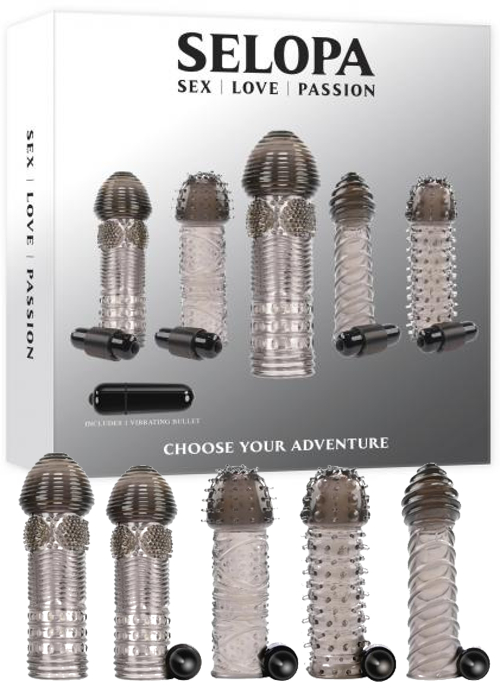 Selopa Choose Your Adventure 5 penis extensions with a vibrating bullet. Each penis sleeve is made using body safe materials phthalate free and latex free Thermoplastic Rubber TPR and the bullet vibrator is made from ABS Plastic. Add length and girth with 5 unique sleeve designs that enhance any sexual experience with tantalizing textures and intense vibrations. Features: sleeves are 5 inches in length. Made from TPR, ABS Plastic. 4 smoke colored sleeves with bullet vibrator hosters at the base of the sleeve.Copyright © 2026 Adnet Media. All Rights Reserved. XBIZ is a trademark of Adnet Media.