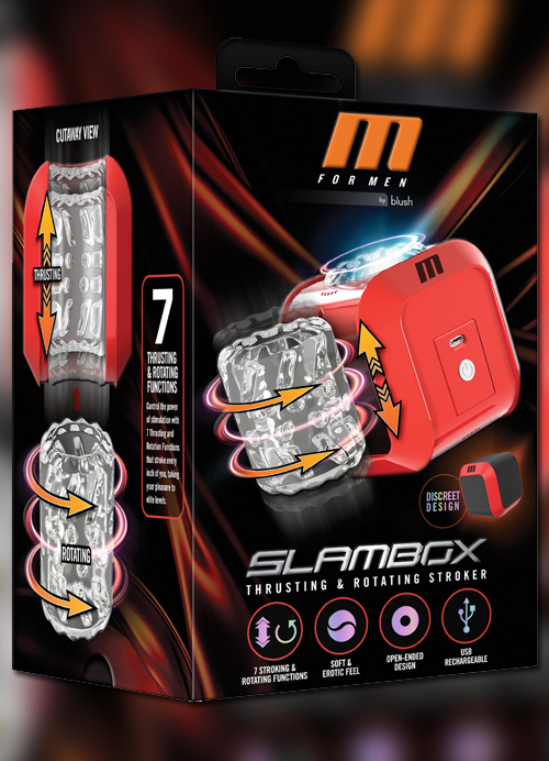 Unleash your desires with the M For Men Slambox! This powerhouse automatic male masturbator is engineered for users who demand more out of their stroker. All packed in a discreet and sleek red box, this stroker is primed to deliver a wild ride of thrills.It's equipped with 7 modes of intense rotational stroking power that envelops you in a vortex of incredibly pleasing sensations. Amp up your experience with each click of a button, while 360° rotational stroking stimulates every inch of you, building up towards a stronger and harder release.