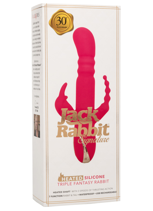 Celebrate 30 years of unparalleled pleasure with the Jack Rabbit® Signature Heated Silicone Triple Fantasy Rabbit, a monument to the evolution of intimate enjoyment. This special edition of the legendary Jack Rabbit® is a symphony of warmth and motion, crafted for those who seek an extraordinary sensory experience. Its innovative design combines an intense heated thrusting shaft with the classic flickering bunny ears and an added tantalizing tail, ensuring a full spectrum of stimulation.The heart of this luxurious toy is its incredible heated shaft, which reaches its maximum temperature in just 4 minutes, inviting you to bask in the warmth of its embrace. This feature, combined with the 3 speeds of precision thrusting action, offers a powerful up-and-down motion that mimics the most attentive lover. The sensation of heat adds a layer of realism and comfort, making each moment more immersive. The independently controlled heating element allows you to tailor your experience, blending warmth with thrusting sensation to create a unique and personalized journey of pleasure.