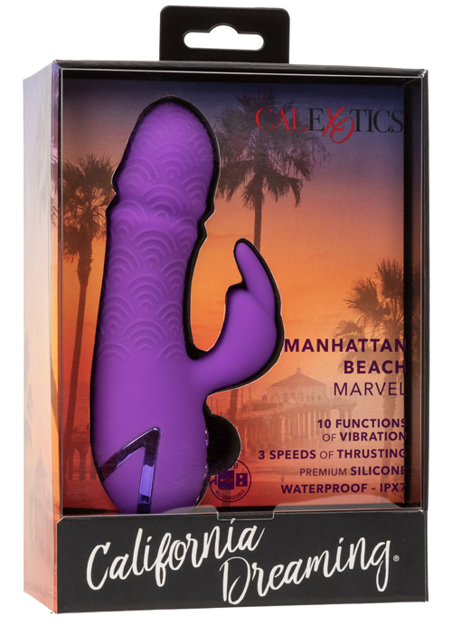 Begin a voyage of exhilarating discovery with California Dreaming® Manhattan Beach Marvel, a dual stimulator that promises the vibrant pulse of city life matched with the ease of beachfront bliss. This compact powerhouse invites a fusion of vibrating and thrusting sensations, tailored for the seeker of a potent and intimate adventure.Indulge in the luxury of choice with three speeds of independent thrusting action, each offering a tactile sensation courtesy of its textured shaft. This deep, rhythmic motion is perfectly paired with 10 functions of independent vibration, pulsation, and escalation in the stimulator. Dual motors ensure that every pulsation and thrust is delivered with precision, orchestrating a crescendo of pleasure that is as unique as your desires.