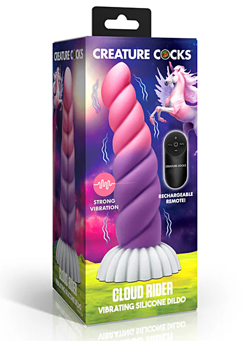 Elevate your fantasy life with the Cloud Rider Unicorn Silicone Dildo! Shaped like a magical unicorn horn and featuring colors of pink, purple, and white, this vibrating dildo has a small, round tip for effortless insertion. Its smooth, graduated bumps provide delightful sensations as you go deeper. Control 3 speeds and 7 vibration patterns using the rechargeable remote for tailored pleasure. The wide suction-cup base allows for hands-free use and compatibility with most strap-on harnesses. Made from premium, body-safe silicone and rated IPX7 waterproof, this toy can be used in the shower or underwater. Always pair with water-based lubricants!Copyright © 2026 Adnet Media. All Rights Reserved. XBIZ is a trademark of Adnet Media.