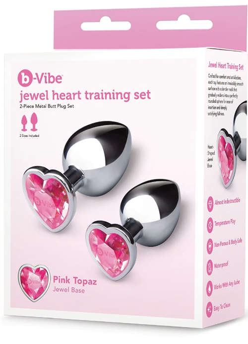 Introducing a luxurious duo who know a thing or two about enhancing your intimate moments: the b-Vibe Jewel Heart Metal Butt Plug Training Set. Witheye-catching heart-shaped pink gem bases and sleek metal bodies, the butt plug duo are not just about anal pleasure but visual thrills too..Crafted for comfort and satisfaction, each toy features an irresistibly smooth surface with a slender neck that gradually widens into a perfectly rounded sphere for ease of insertion and deeply satisfying fullness.