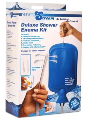 Cleanse your derriere the easy way with this Deluxe Shower Enema Kit! Feel fresher than ever before and enjoy the full feeling you get from lots of liquid adding a delightful pressure inside you. The kit has everything you need to get started and includes one 1.85L enema bag, one 5 foot tubing with flow valve, three flexible tips, one tapered tip, one nozzle tip, one stainless steel hook, one plastic hook, one flow clamp, one stopper, one stopper with tubing adapter. Easily control the water flow with the control valve on the hose so you can slow it down and take it easy as you fill yourself completely. Everyone has their preferences; find out what you like as you explore different tips! Choose between flexible, tapered and nozzle tip. As it hangs above, you can enjoy coffee enemas, salt-water enemas, or simply a warm water cleanse for both health and pleasure! Keep yourself fresh and cleaned out without the hassle and use it in your own shower for both privacy and comfort! All metal used is nickel-free for sensitive skin. Both plastic and rubber are predominantly used so you can safely use a silicone lube to help with smooth, slick insertion. Afterwards, wash it with warm water and soap and let it air dry.Enjoy feeling fresh as often as you like with this easy to use enema kit! Simply put it all together, choose the tip of your preference, and then hang it up and fill it with fluid. The feeling of getting filled up is both vulnerable and exhilarating! It puts pressure on your most sensitive organs while also cooling or warming you up. People have used enemas medicinally, but they can be used for fun as well! If you've got a hot date and you intend to let them get deep, deep inside your derriere, an enema is a perfect way to ensure cleanliness! Make sure to allow yourself plenty of time to fully evacuate all the fluid inside after filling yourself up. It can take several trips to the toilet to allow it all to come out. Walk around and let your body move as the fluids move, and stay nearby a toilet for 30 minutes to an hour after a deep, full cleanse. Then you can feel refreshed and ready for a fun night ahead, or simply do it to feel good yourself!